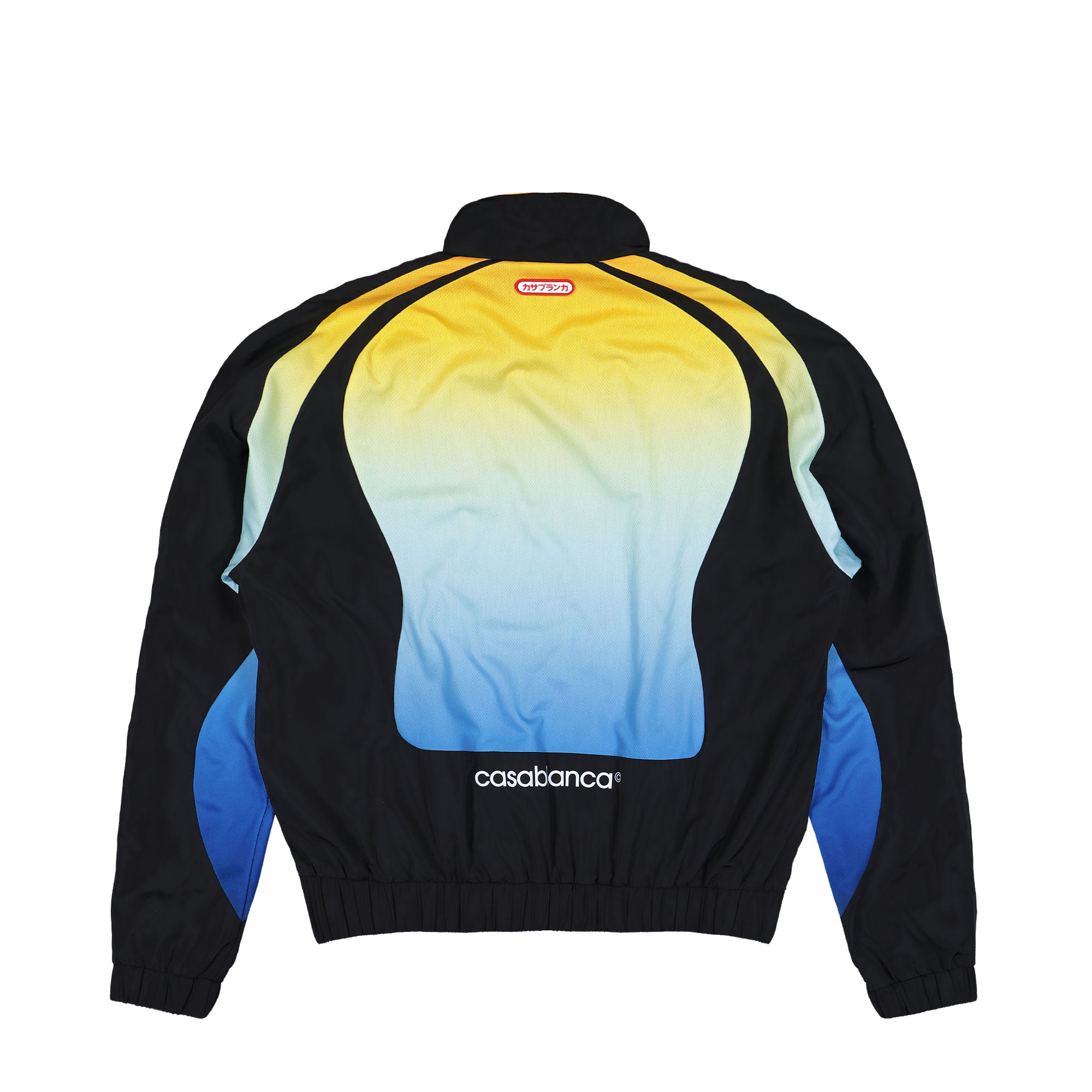 Der Gradient-Windbreaker ist eine sportliche Track Jacket mit dem ikonischen, ineinander verschlungenen CC-Logo und einem Aufnäher mit dem Logo von Casablanca. Die saisonale Farbgebung ist von den lebendigen und dynamischen Farbmustern der Pfeilgiftfrösche inspiriert. Die kräftigen Blau- und Gelbtöne sind als natürliche Warnfarben zu verstehen, während die tiefschwarzen Einsätze die natürlichen Muster dieser Amphibien widerspiegeln. Die schwarzen Akzente sind organisch in das Design integriert und erinnern an die charakteristischen Muster der Frösche. Zu den wichtigsten Details gehören ein hoher Kragen mit gelbem Saum, ein Kordelzug, eine vordere Reißverschlussöffnung mit einem Klappverschluss mit Diamantlogo, elastische Bündchen und Saum sowie schwarze Kontrastflächen.