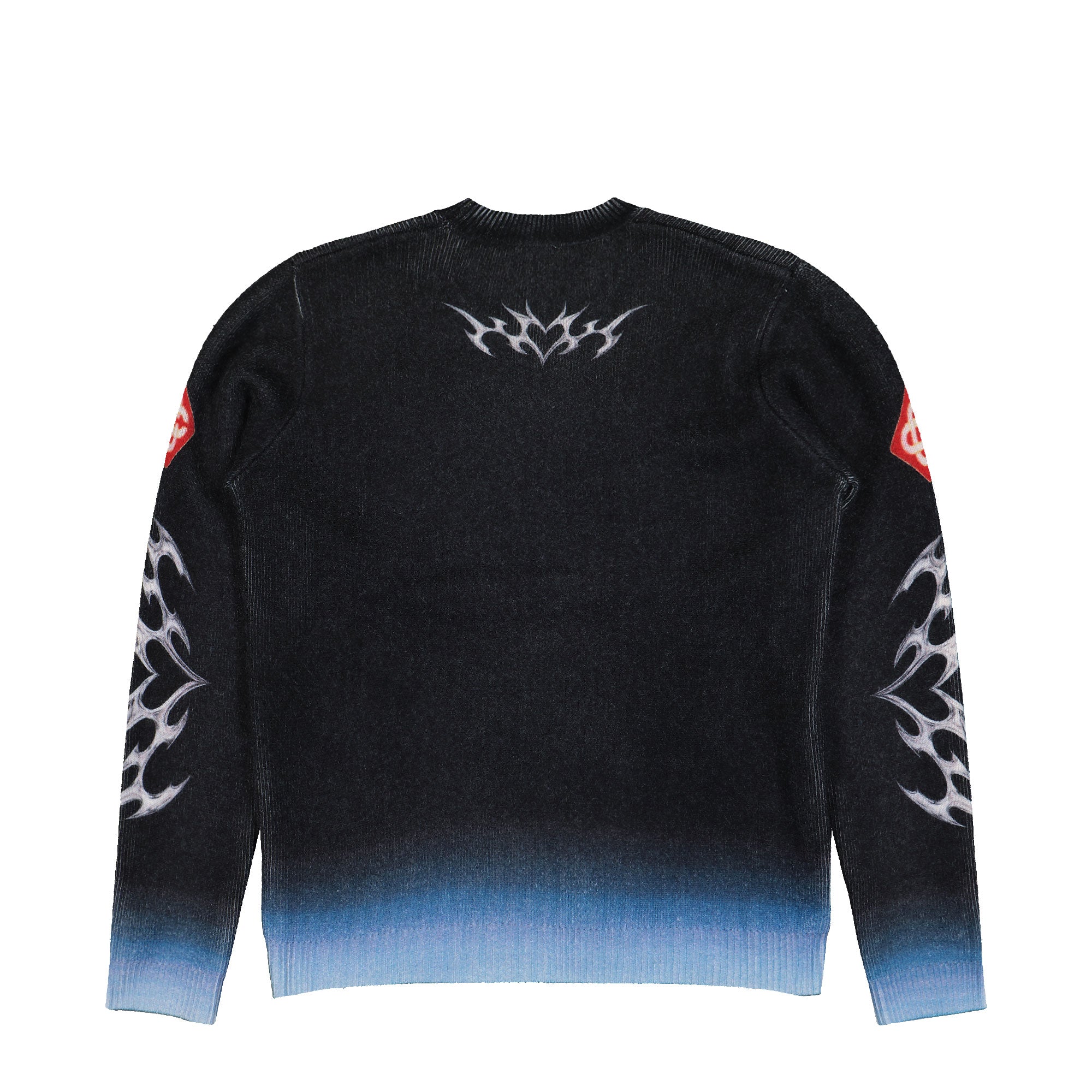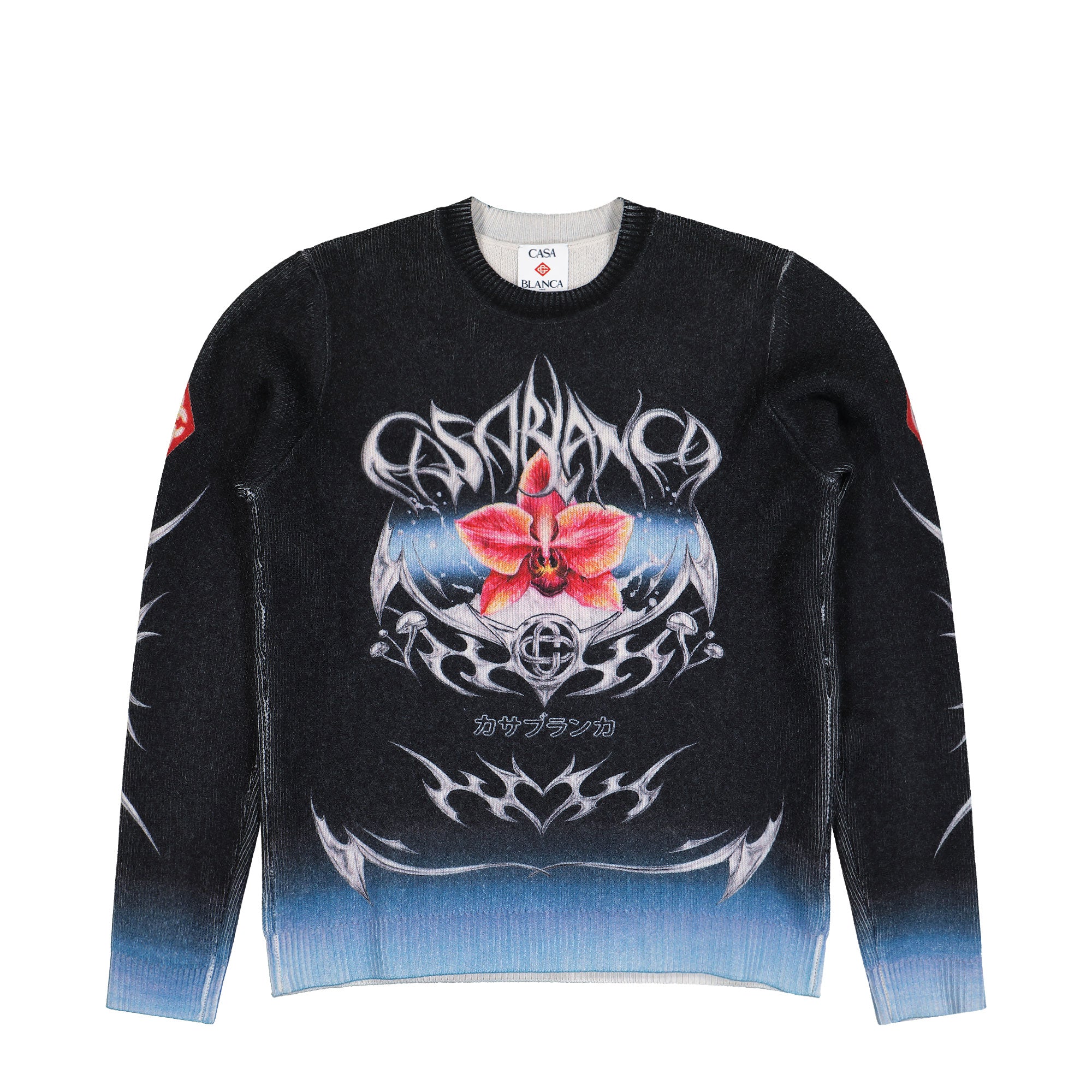 The Blades Printed Crew is a sophisticated cashmere blend pullover combining long sleeves with a striking printed design. It juxtaposes the sharp, cool tones of silver chrome blades against the natural warmth of vibrant pink and red orchid hues, enhanced by refreshing water droplet details. Finished with ribbed cuffs and collar, this piece balances edgy elegance and comfort for a refined seasonal statement.