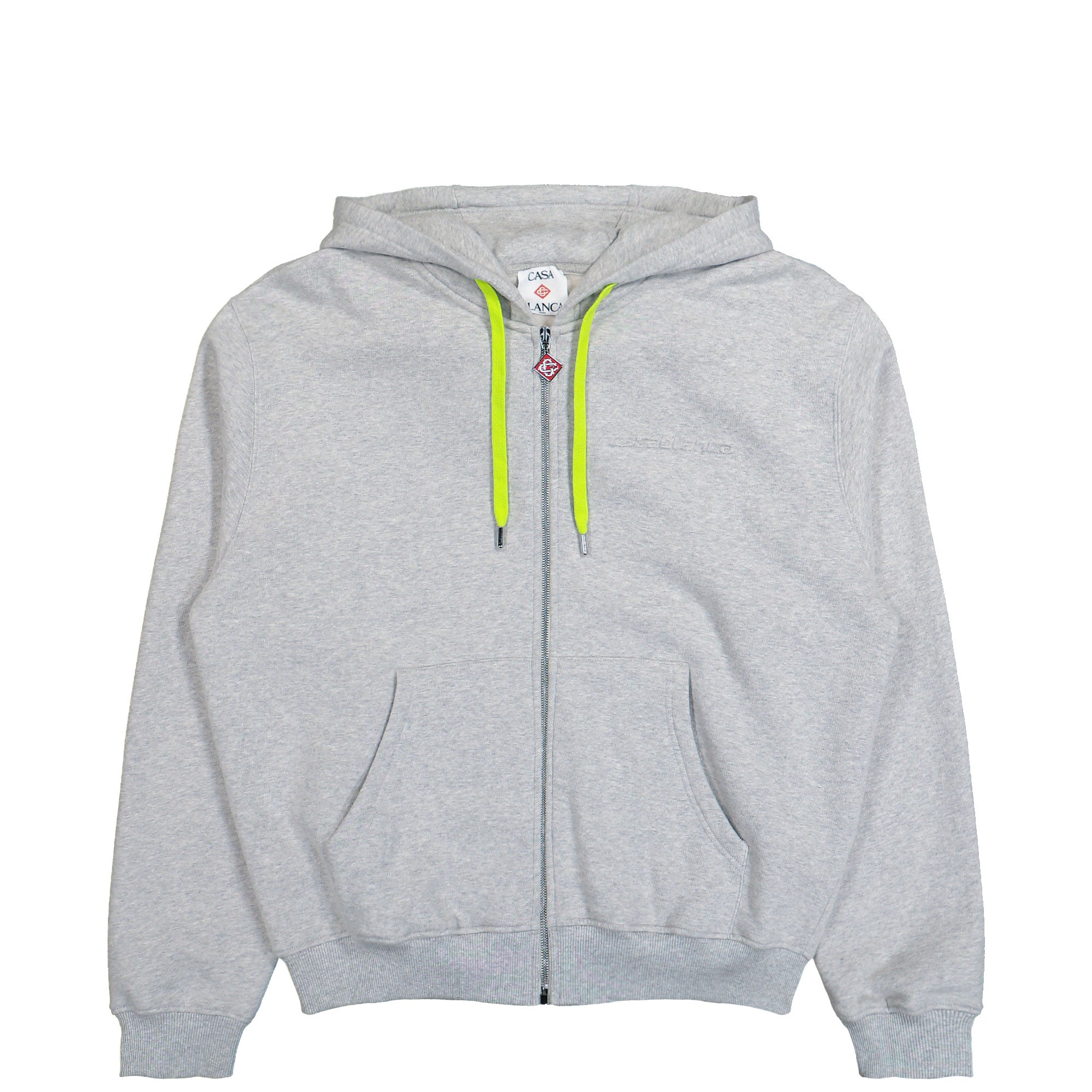 The Casablanca Cashmere Blend Zip-Up Hooded Sweatshirt in Grey Marle combines luxurious comfort with a modern, sporty-elegant silhouette and stands out as a versatile essential for refined everyday wear. The premium fabric blend with a fine cashmere content delivers an exceptionally soft feel, pleasant warmth and an elevated texture that clearly sets it apart from classic sweatshirt materials. The Grey Marle colorway features a balanced melange of light and mid-grey tones, adding depth, visual structure and a timeless, clean appearance. Thanks to the full-length zipper, the hooded sweatshirt can be styled with flexibility, while the carefully constructed hood with drawstring provides additional comfort. Ribbed cuffs and hem ensure an optimal fit and enhance the overall premium look. Subtle design details and precise craftsmanship reflect Casablanca’s distinctive commitment to quality and style. Whether worn as a warming layering piece or as a standalone key item, this zip-up hoodie impresses with functionality, refined materials and a restrained modern aesthetic.