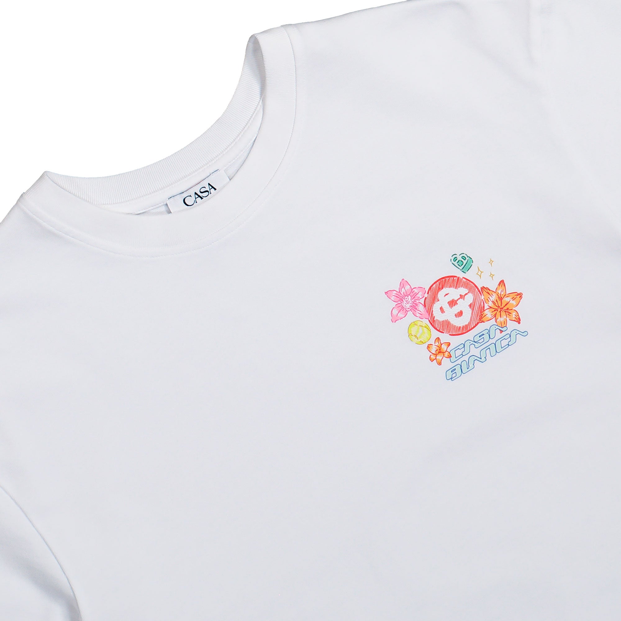 The Casablanca Collage D'Icones Graphiques Oversized T-Shirt ( M-SS26-JTS-044-13 ) stands out as an expressive fashion piece with artistic character and premium craftsmanship. The Collage D'Icones Graphiques colorway is built on a clean, bright white base that serves as a calm canvas for the finely detailed chest graphic. Positioned on the left chest, a vibrant graphic composition unfolds with floral elements, iconic symbols and the signature Casablanca lettering. Bold shades of red, pink, orange, yellow, green and light blue create striking accents that contrast sharply with the light background, resulting in a modern yet playful appearance. The oversized cut delivers a relaxed silhouette with generous proportions, while the classic crew neck and clean lines maintain visual balance. Crafted from high-quality jersey fabric, the T-shirt offers a smooth texture and comfortable feel. The back remains intentionally plain in pure white, enhancing the visual impact of the front design. This style combines contemporary aesthetics with artistic detail, making it ideal for distinctive, refined outfits.