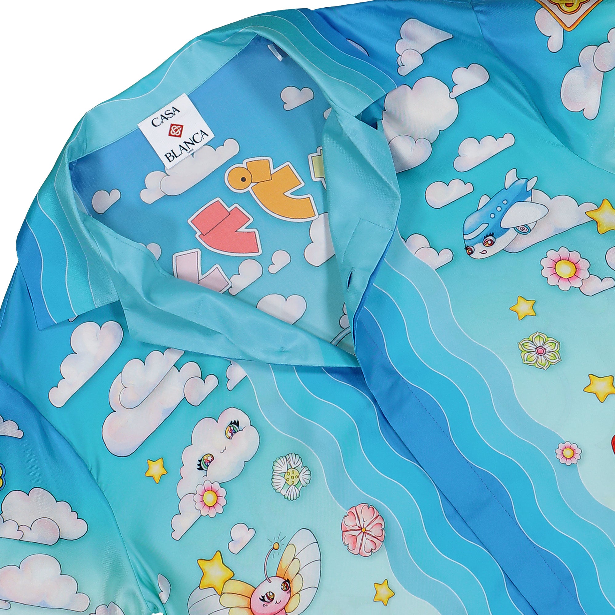 This silk twill short-sleeved shirt features an all-over printed Kawaii motif inspired by a tennis club layout, centered around charming Kawaii elements. Rendered in soft pastel tones, it boasts a sophisticated Cuban collar and button fastening with signature Corozo buttons showcasing the iconic interlocking CC logo. Subtle Memphis wave-inspired detailing on the collar, cuffs, and hem adds refined character, marrying playful design with expert craftsmanship for a contemporary, elegant look.