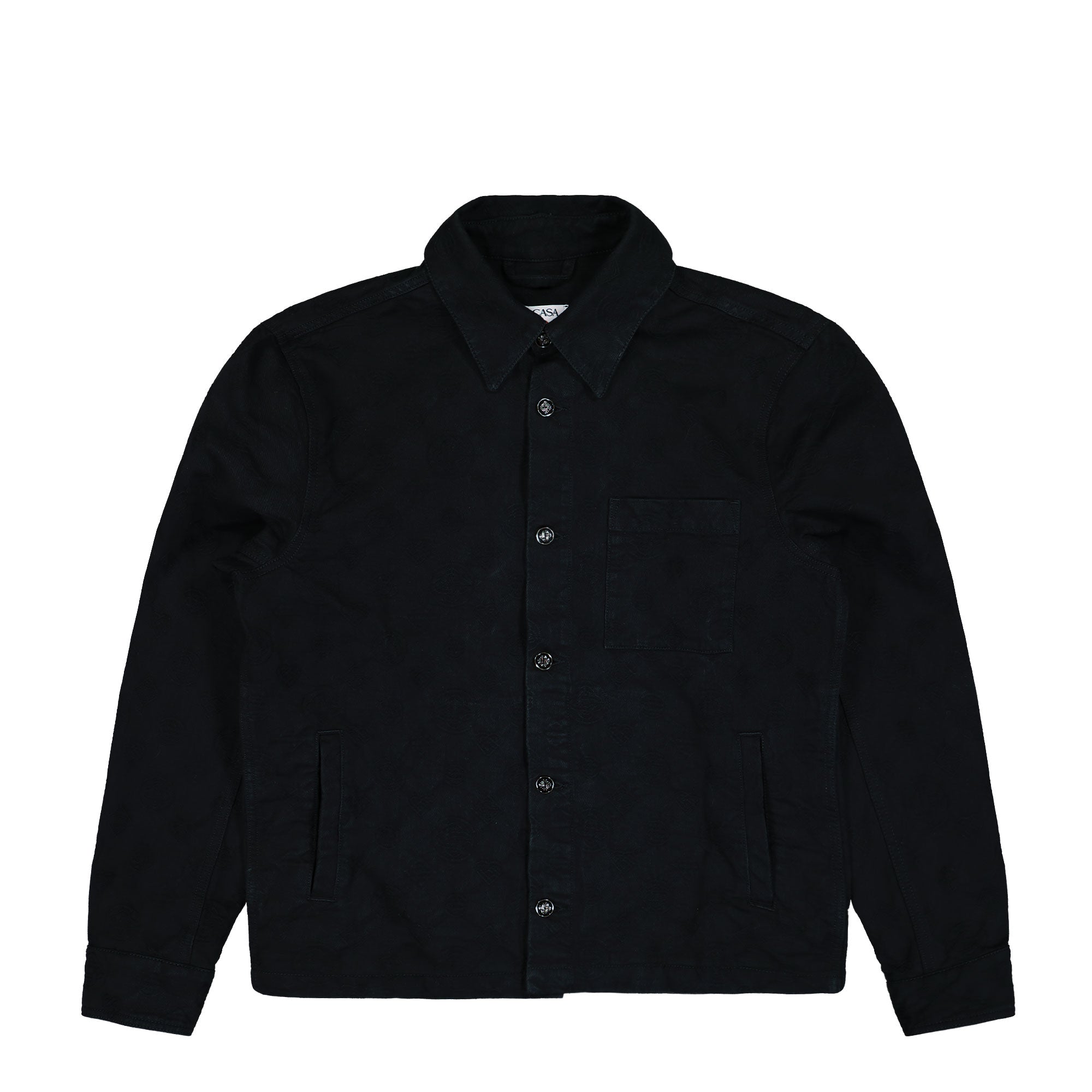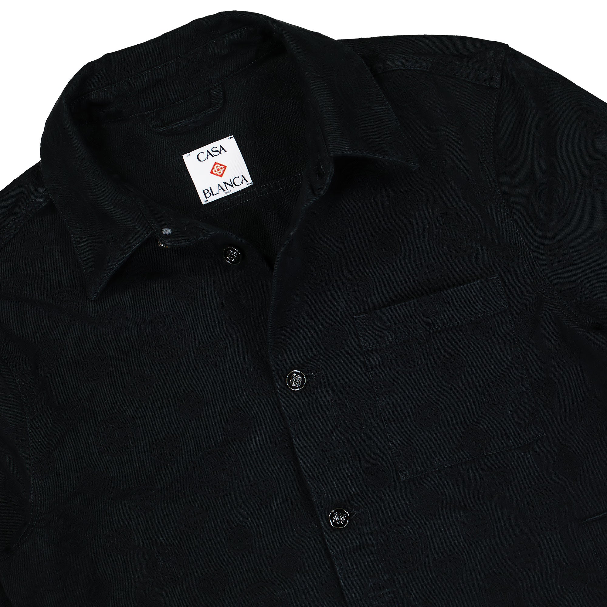 The Denim Monogram Shacket combines classic craftsmanship with a distinctive pattern featuring the Casablanca Honeydew logo. Its unique monogram integrates original shapes for a signature look, elevated by a pointed collar and button fastening. Practical details include a breast pocket and vertical slanted pockets, while the iconic interlocking CC enamel buttons with gold rims provide a refined, luxurious touch. Perfect for layering, this long-sleeve overshirt offers both style and functionality with expert design details.