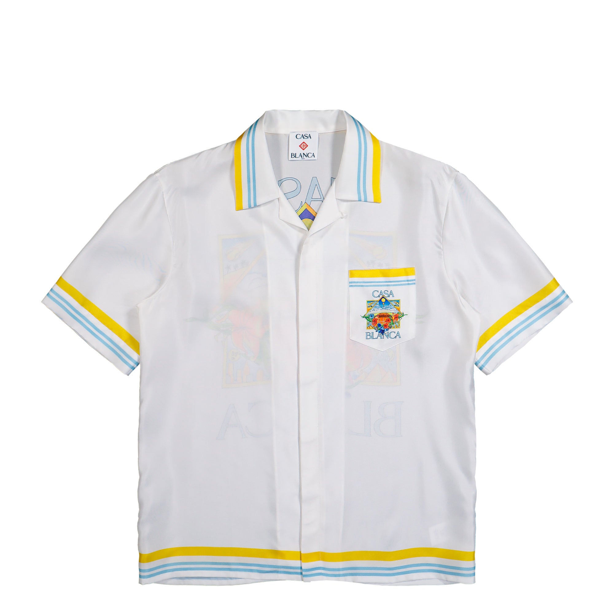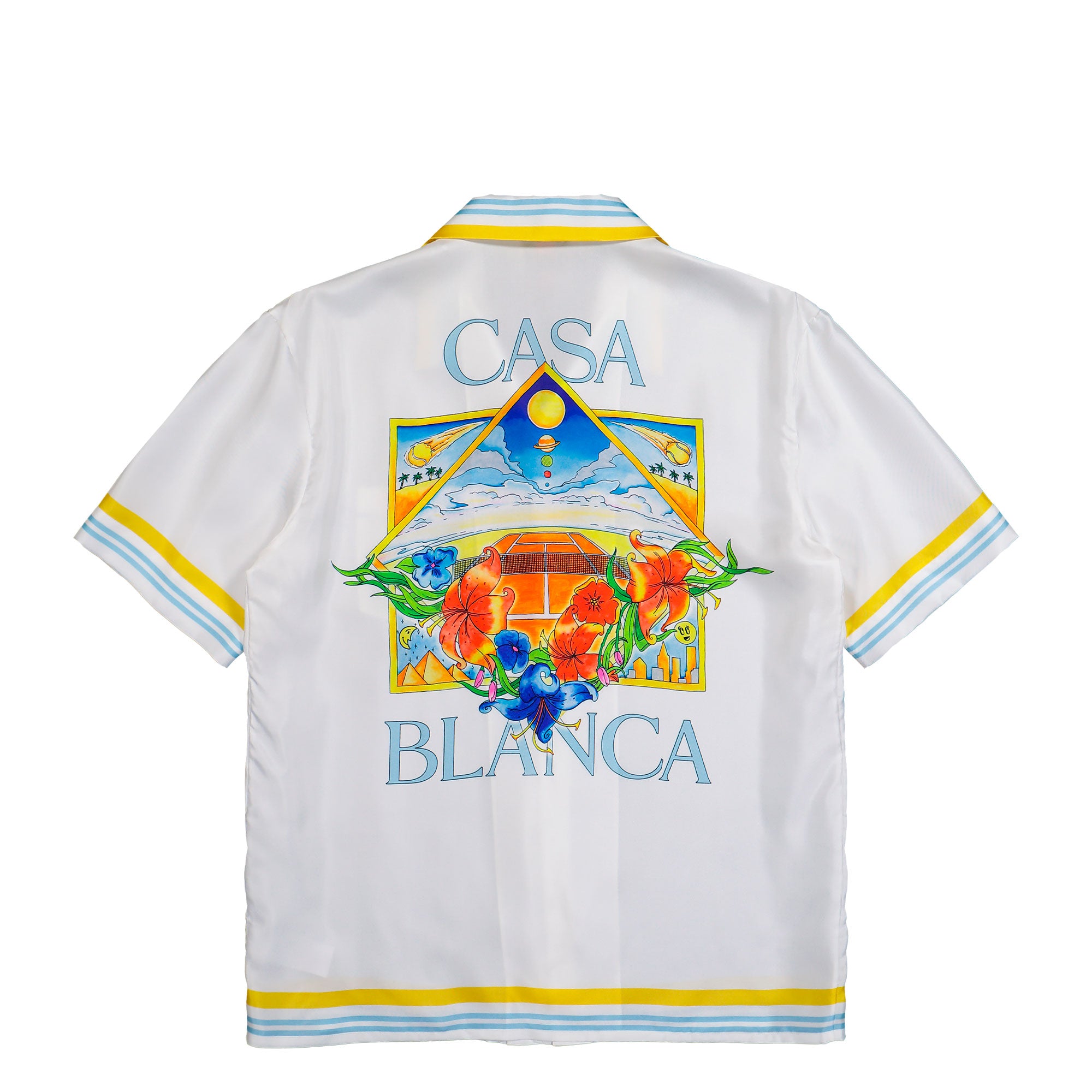 Casablanca Tennis Landscape Cuban Collar SS Shirt ( M-SS26-SH-003-04 ) comes in the expressive Flower Court Icon colorway, combining summery ease with the brand’s distinctive visual language. The short-sleeved silhouette with a Cuban collar creates a relaxed yet refined look, while the smooth, flowing fabric feels cool and comfortable against the skin. A clean, soft white base forms the foundation, acting as a canvas for vibrant accents. Along the collar, sleeve hems, and hemline, stripes in bright yellow as well as light blue and turquoise add fresh contrast. A detailed motif on the chest pocket blends a tennis court with floral elements and graphic shapes, rendered in rich tones of orange, blue, and green. The back echoes this artwork on a larger scale, enhancing the depth and impact of the design. Fine lines, balanced color blocking, and the generous use of white give the shirt a premium, contemporary appearance. The Casablanca Tennis Landscape Cuban Collar SS Shirt Flower Court Icon is easy to style and pairs effortlessly with lightweight trousers or shorts, making it a confident choice for warm-weather outfits.