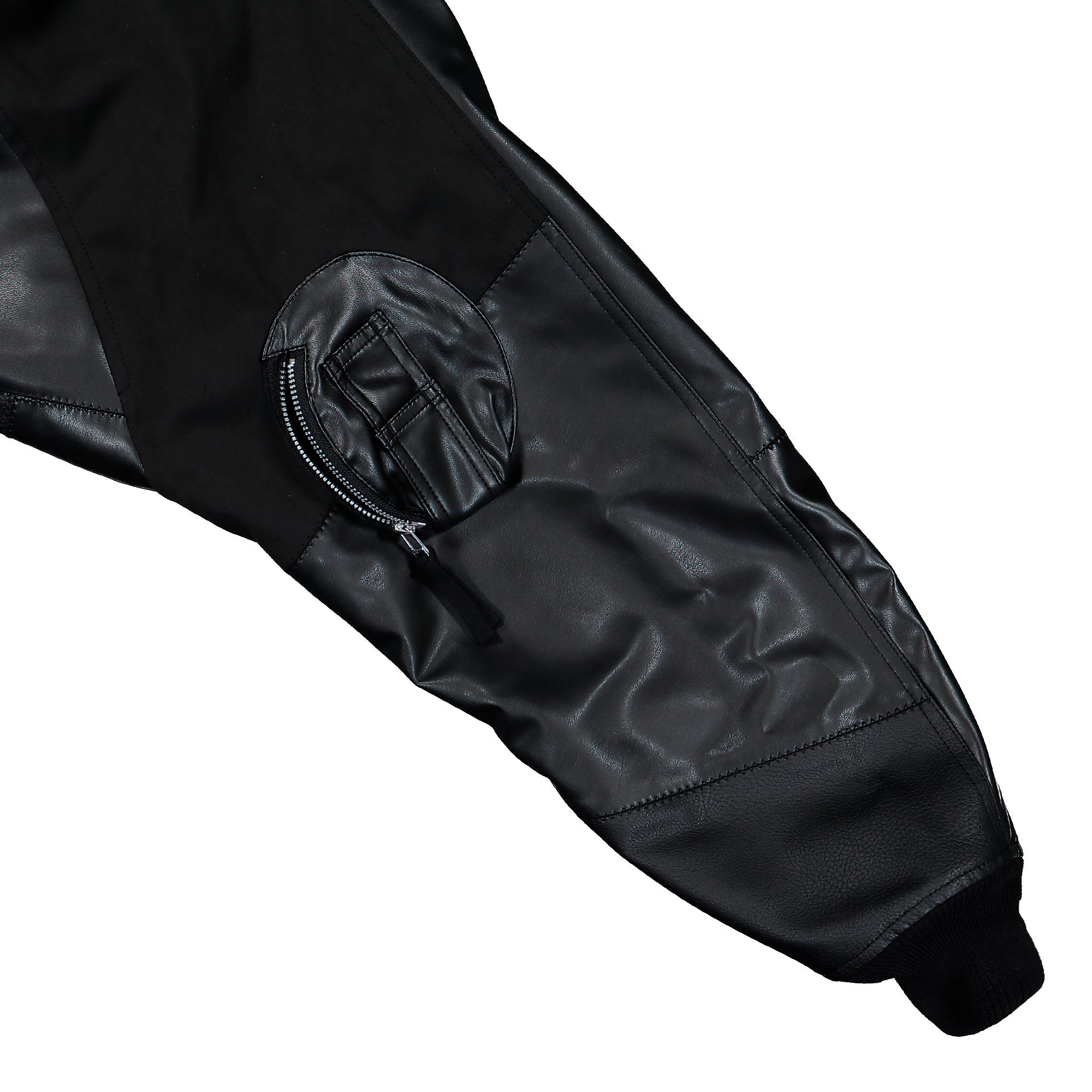 This Comme des Garçons Homme jacket exemplifies the label's signature approach to utilitarian design. Constructed from mixed materials with prominent synthetic leather paneling, the piece channels motorcycle and workwear aesthetics through its structured silhouette and assertive proportions. The jacket features strategically placed functional pockets—including side-entry and vertical chest options—paired with robust hardware and quality zippers that reinforce its architectural intent. The textural interplay between materials creates visual depth while maintaining the refined edge characteristic of the house's design philosophy.