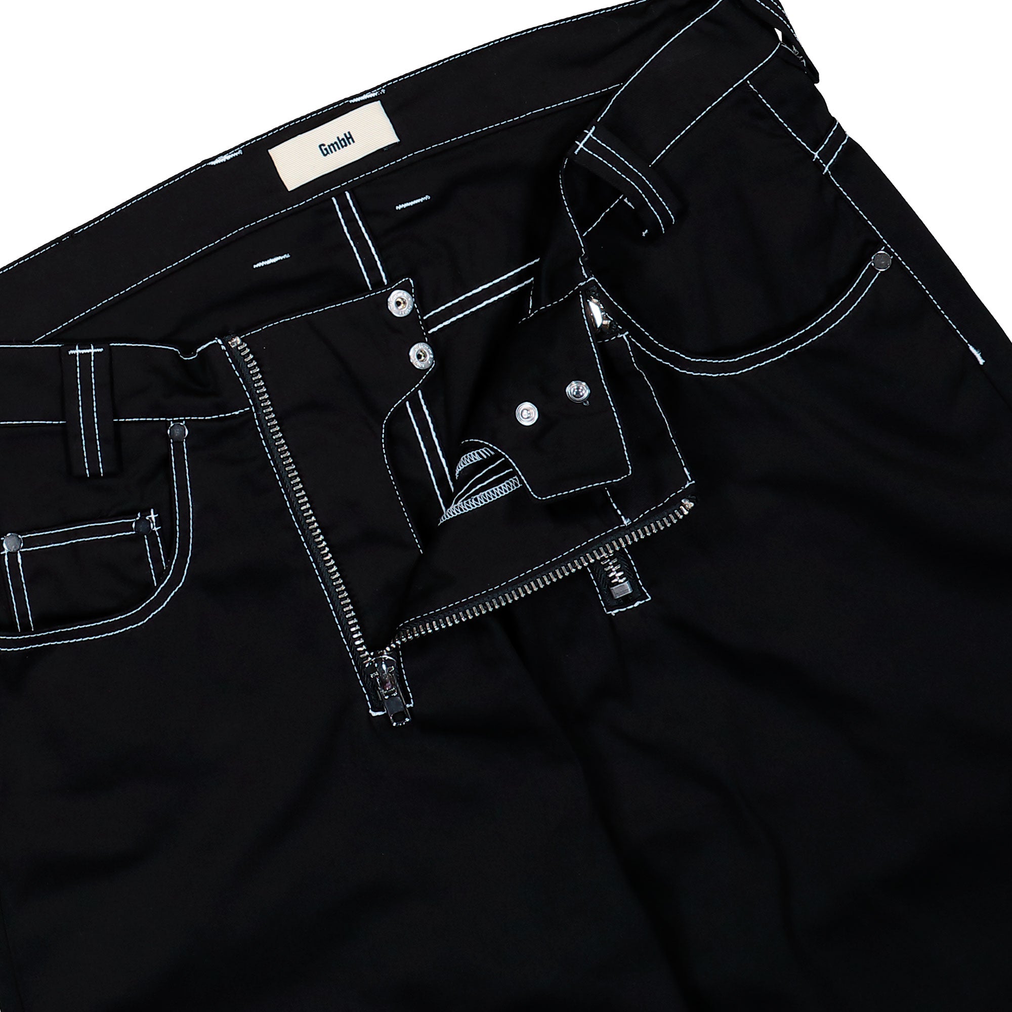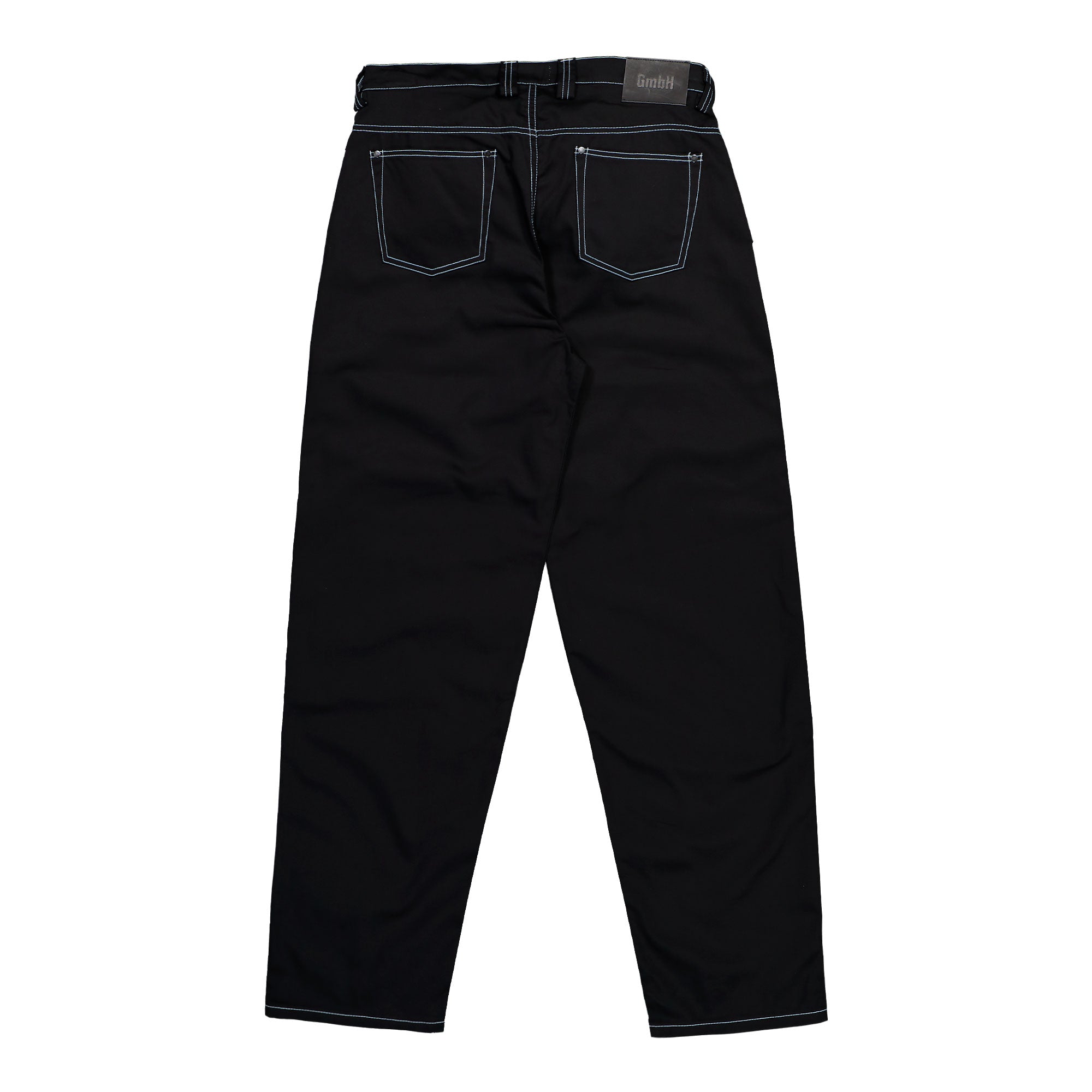 The GmbH Wide Leg Trousers With Double Zip (Cyrus) in Black, crafted from premium cotton twill, stand out with their striking silhouette and precisely executed details. The firm yet comfortable cotton twill fabric provides structure and shape, while the deep black appears in a rich, even tone enhanced by contrasting white stitching. These contrast seams along the pockets, belt loops, and hems create graphic lines that emphasize the architectural wide leg fit. Two parallel front zippers serve as a functional highlight and reinforce the progressive design. Classic five-pocket elements meet a modern cut, creating a balanced blend of utility aesthetics and contemporary style. On the back, patch pockets with clearly defined stitching and a subtle logo patch on the waistband complete the look. The Cyrus trousers in black are versatile to style and bring a confident, urban edge to any wardrobe through their material, cut, and refined detailing.