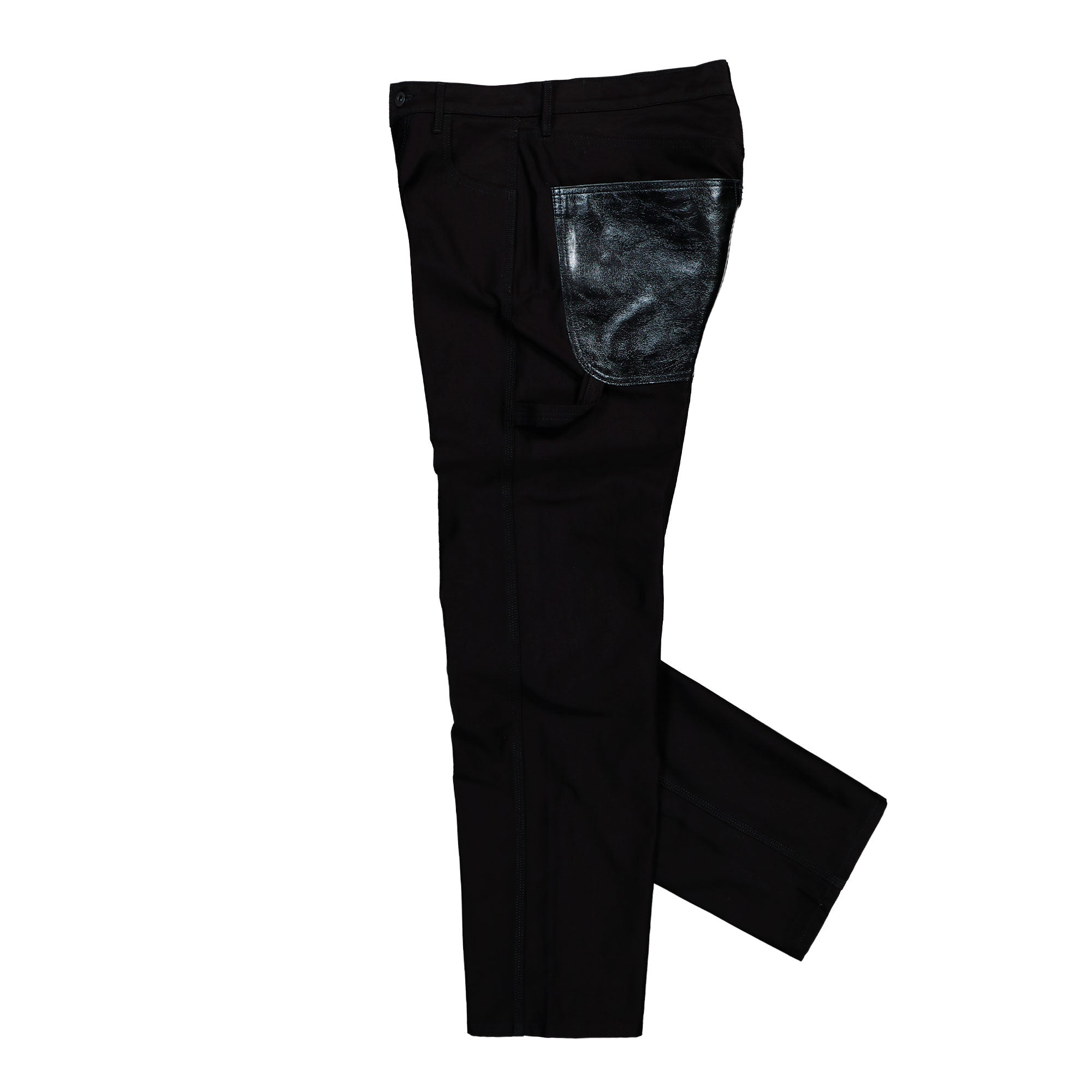 Introducing the brand's iconic deconstructed denim reimagined in tonal black. This avant-garde interpretation deconstructs the traditional five-pocket jean through strategic patchwork panelling, layering contrasting textures of black denim, leather, and premium woven materials—cotton and wool—across the silhouette. The monochromatic palette allows the interplay of fabrics and finishes to command attention, creating visual depth through material variation rather than color contrast. Anchored by classic pocket construction and a refined button-zip fly, the design maintains functional integrity while the subtly matched hardware complements the sophisticated aesthetic. A masterwork of deconstruction that transforms the everyday jean into a statement of meticulous craftsmanship and contemporary design vision.