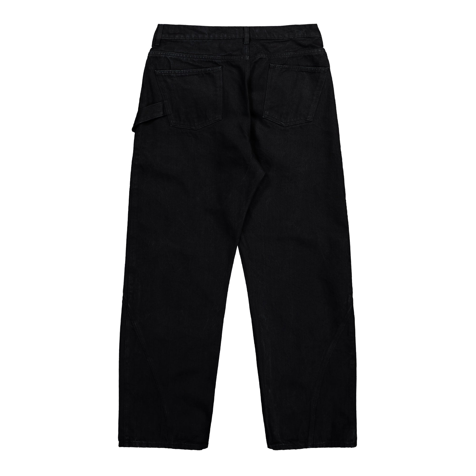 The JW Anderson Twisted Workwear Jeans stands out with deep black denim and distinctive seam construction that gives the design a contemporary edge. Its relaxed fit offers comfortable wear while the curved front seams create a dynamic silhouette. An asymmetrically placed textured front pocket and a side loop introduce subtle workwear influences that add refinement to the piece. The clean shaped back pockets enhance the minimal look and complete the rear view with balance. The dense premium denim emphasizes the richness of the black tone and supports versatile styling ranging from casual combinations to more polished outfits. Metallic accents provide gentle highlights without disrupting the understated character. The Twisted Workwear Jeans reimagines classic denim elements in a modern way, delivering a piece full of personality defined by its unique cut and relaxed drape.