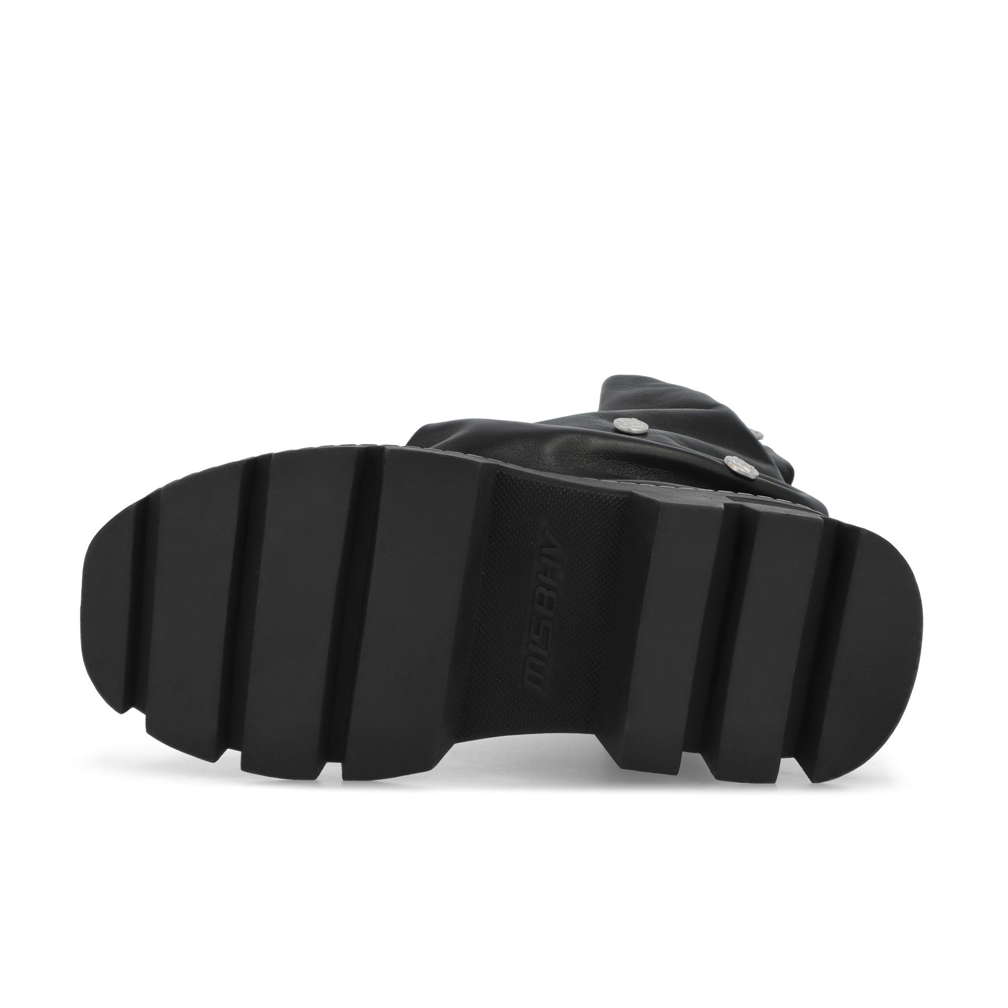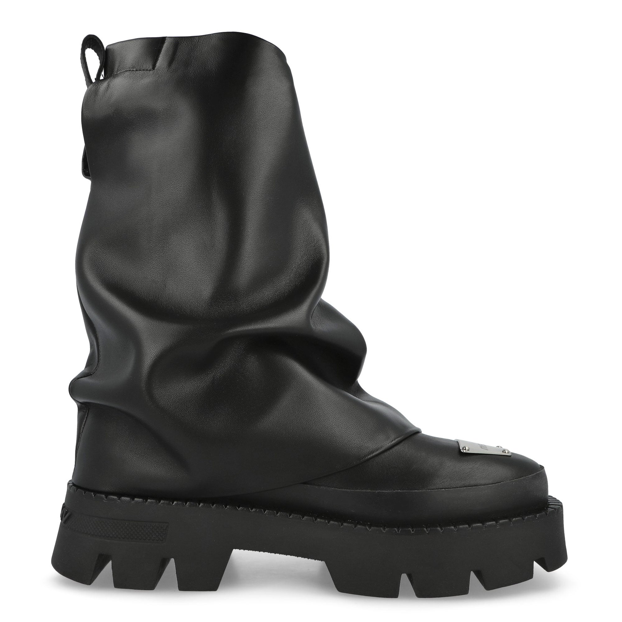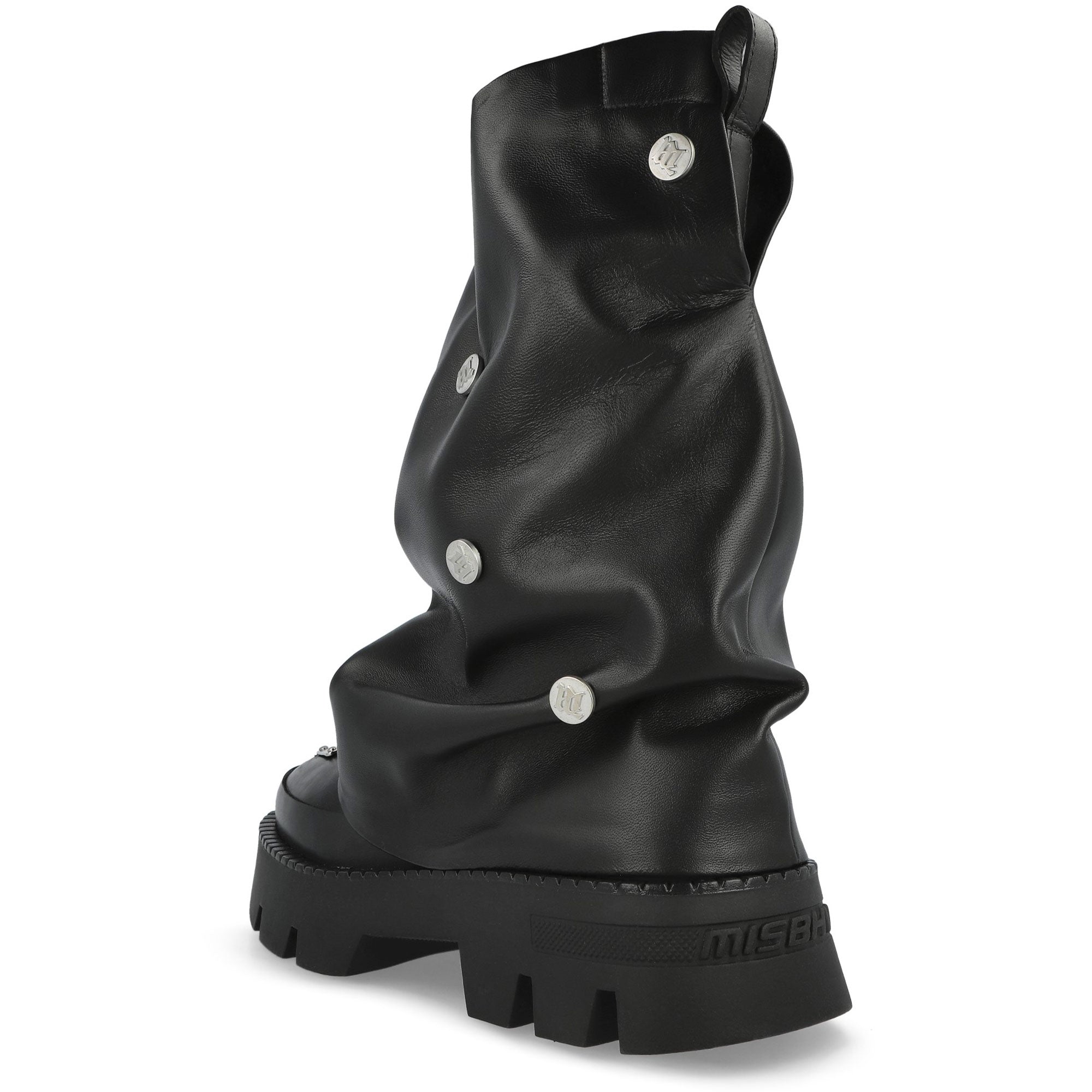 The MISBHV Chelsea Covered Boots present a striking blend of futuristic styling and everyday functionality. Their distinctive look is shaped by the soft, draped cover that envelops the shaft, creating a fluid and sculptural appearance. This effect is accentuated by multiple metal logo snaps that act as bold highlights and emphasize the progressive design approach. The rugged, deep-tread sole provides a secure step and adds strong visual impact, seamlessly integrating into contemporary outfits. An elastic panel on the inner boot allows for easy entry and ensures comfortable wear, while the metal plate at the toe introduces an additional focal detail. This model reimagines the classic Chelsea boot with a fresh perspective, appealing to those who appreciate a confident style combined with reliable comfort. The matte finish of the upper complements the voluminous shape, resulting in footwear that merges visual statement and practical performance while remaining adaptable to various looks.