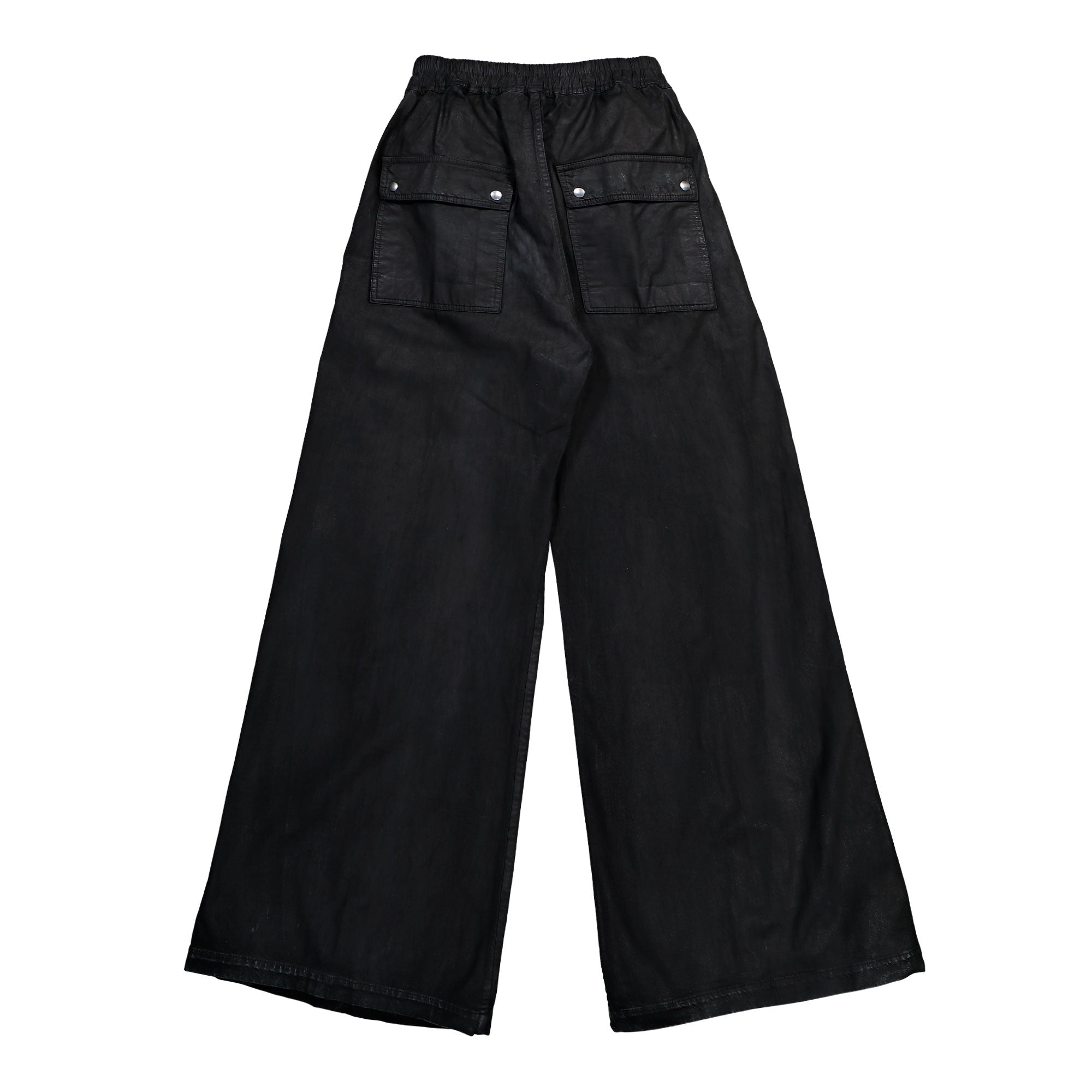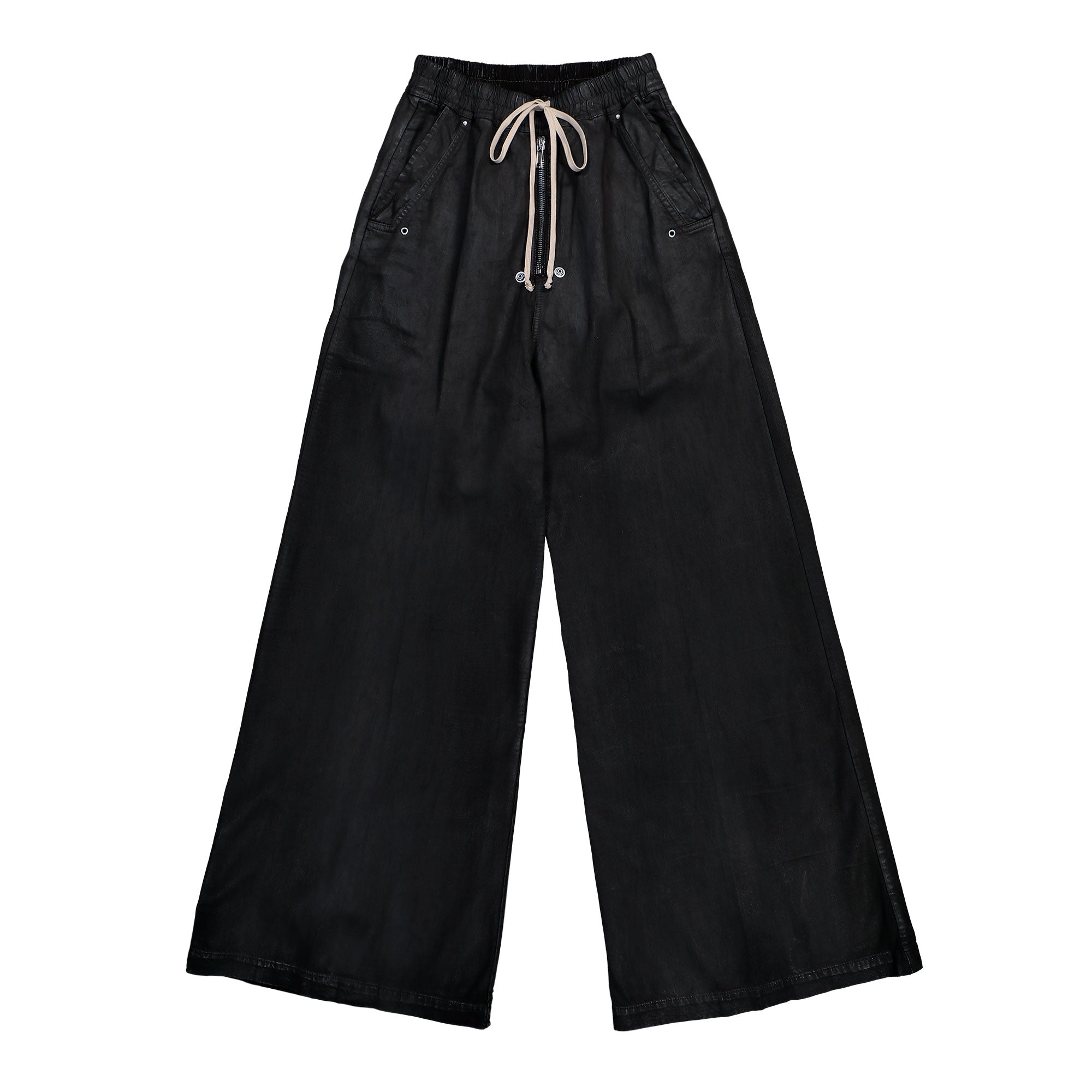 The Rick Owens Geth Belas Denim Pants DU01F4378 DBK 09 are defined by a radically wide silhouette with a fluid drape and distinctly elongated leg line. The deep black denim features a subtly coated surface that shifts between rich jet black and soft smoky undertones. The exaggerated cut creates a sculptural shape that precisely embodies the signature Geth Belas look. An elastic waistband ensures comfort, while the long light-colored drawstring adds a striking contrast to the dark base tone. A visible front zipper construction along with metal eyelets and snap buttons emphasize the functional character and enhance the progressive aesthetic. Patch back pockets with flap and snap details add dimension to the design, giving these black designer pants additional depth. Paired with heavy boots or minimalist silhouettes, these Rick Owens denim pants express a strong presence between avant-garde fashion, darkwear influences, and contemporary luxury design.