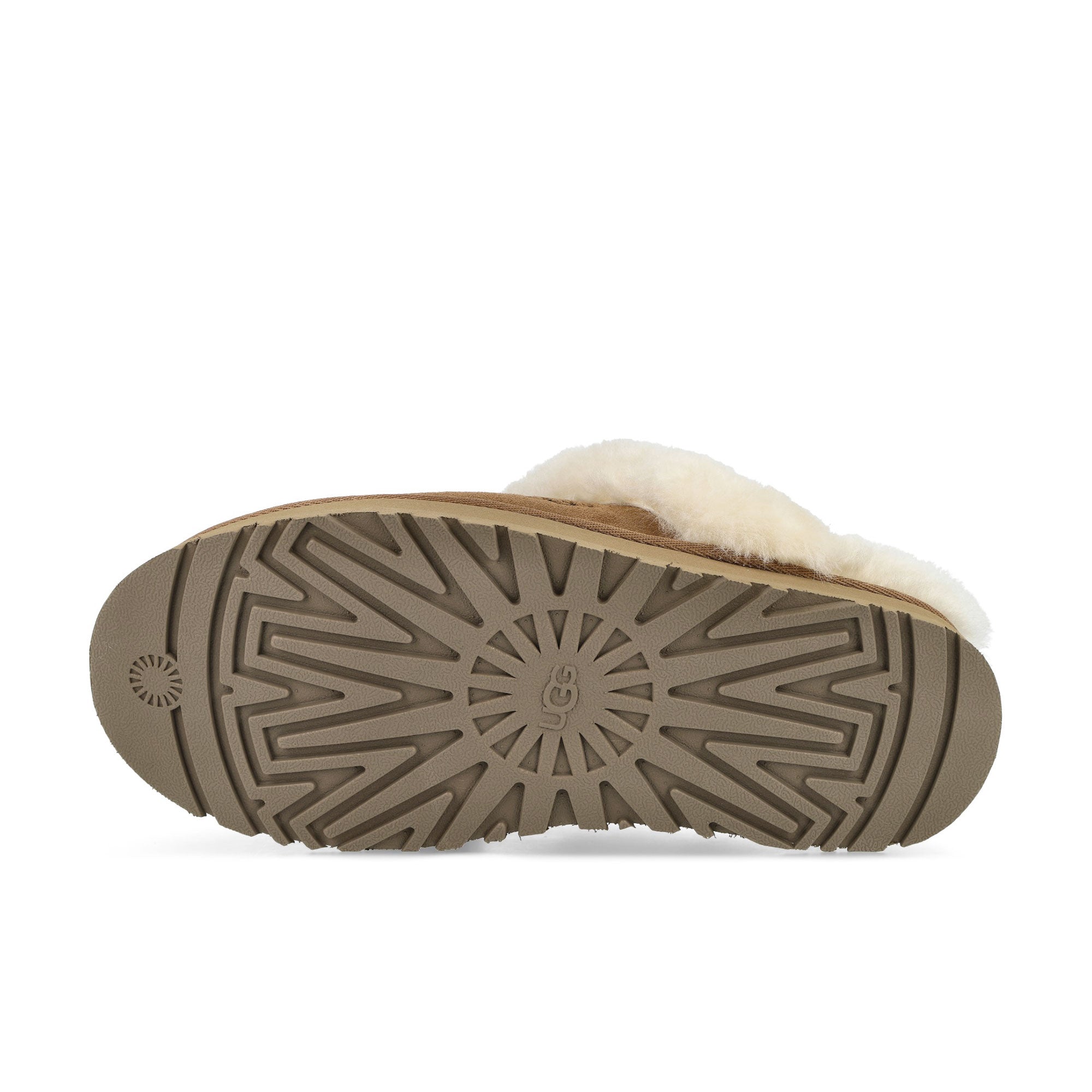The UGG W Disquette ( 1122550-CHE ) combines bold comfort with a confident look and reinterprets the classic UGG style in a modern way. The upper made from high-quality suede appears in a warm, rich brown tone reminiscent of chestnut wood, revealing soft and natural nuances depending on the light. The design is complemented by a plush sheepskin collar whose lighter contrast adds visual depth. Inside, the 17 mm thick sheepskin lining together with the equally thick sheepskin insole ensures a soft feel and reliable warmth. The elevated silhouette with a platform height of 2.5 cm gives the model a contemporary touch without sacrificing comfort. Thanks to the lightweight EVA midsole and the durable EVA sugarcane outsole or Treadlite by UGG™ outsole, the Disquette offers balanced cushioning and dependable traction. Subtle branding details such as the woven label and the heat-embossed UGG® logo complete the premium overall appearance.