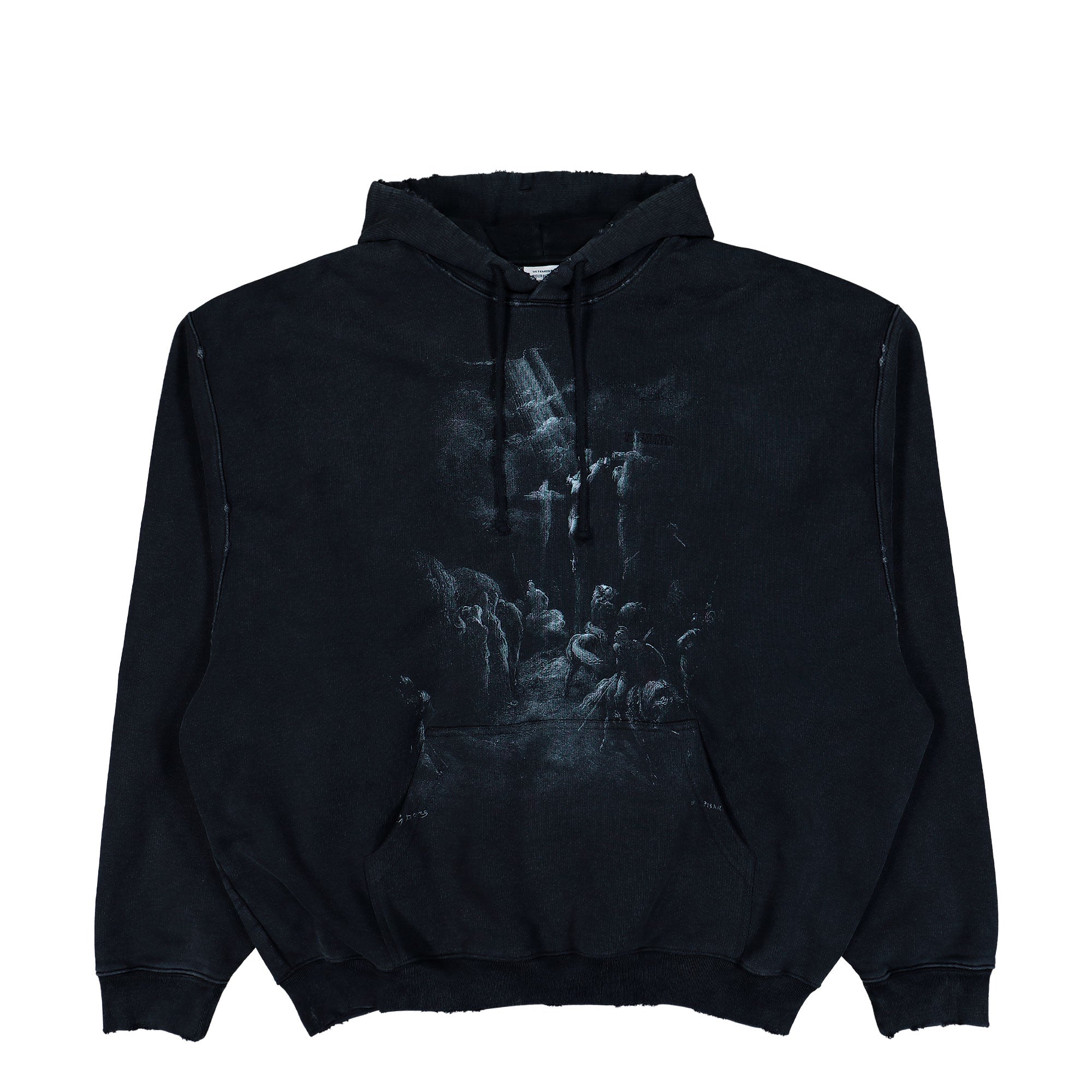 The VETEMENTS Jesus On A Cross Distressed Hoodie in Washed-Out Black stands out as a statement designer piece with artistic depth and a distinctive vintage aesthetic. The intensely washed colorway shifts between matte deep black and smoky anthracite, creating a deliberately aged appearance further emphasized by subtle used effects along the hem, hood, and cuffs. The large-scale Jesus-On-A-Cross motif on the front appears in a contrasting chalk-like grey tone, resembling a faded painting on a dark canvas. The combination of the washed surface and detailed print adds remarkable visual depth to the hoodie. Crafted from premium cotton fleece, it offers a comfortable yet durable feel, while the oversized fit with dropped shoulders creates a modern, relaxed silhouette. A spacious kangaroo pocket and drawstring hood enhance its functional appeal and complete the overall design. This model merges avant-garde fashion with iconic imagery, delivering a bold statement within the premium segment.