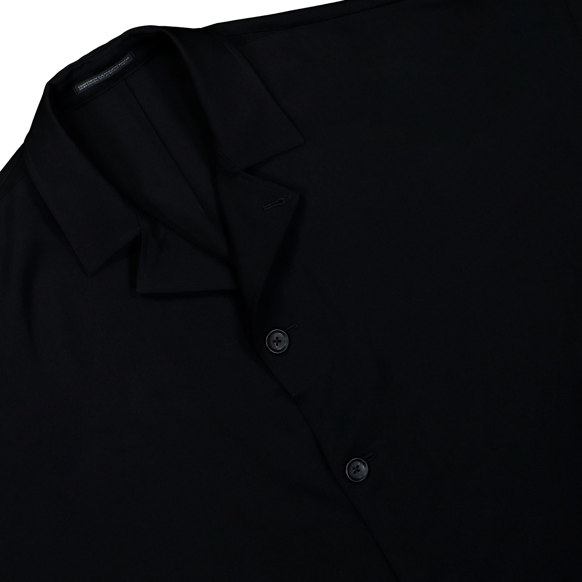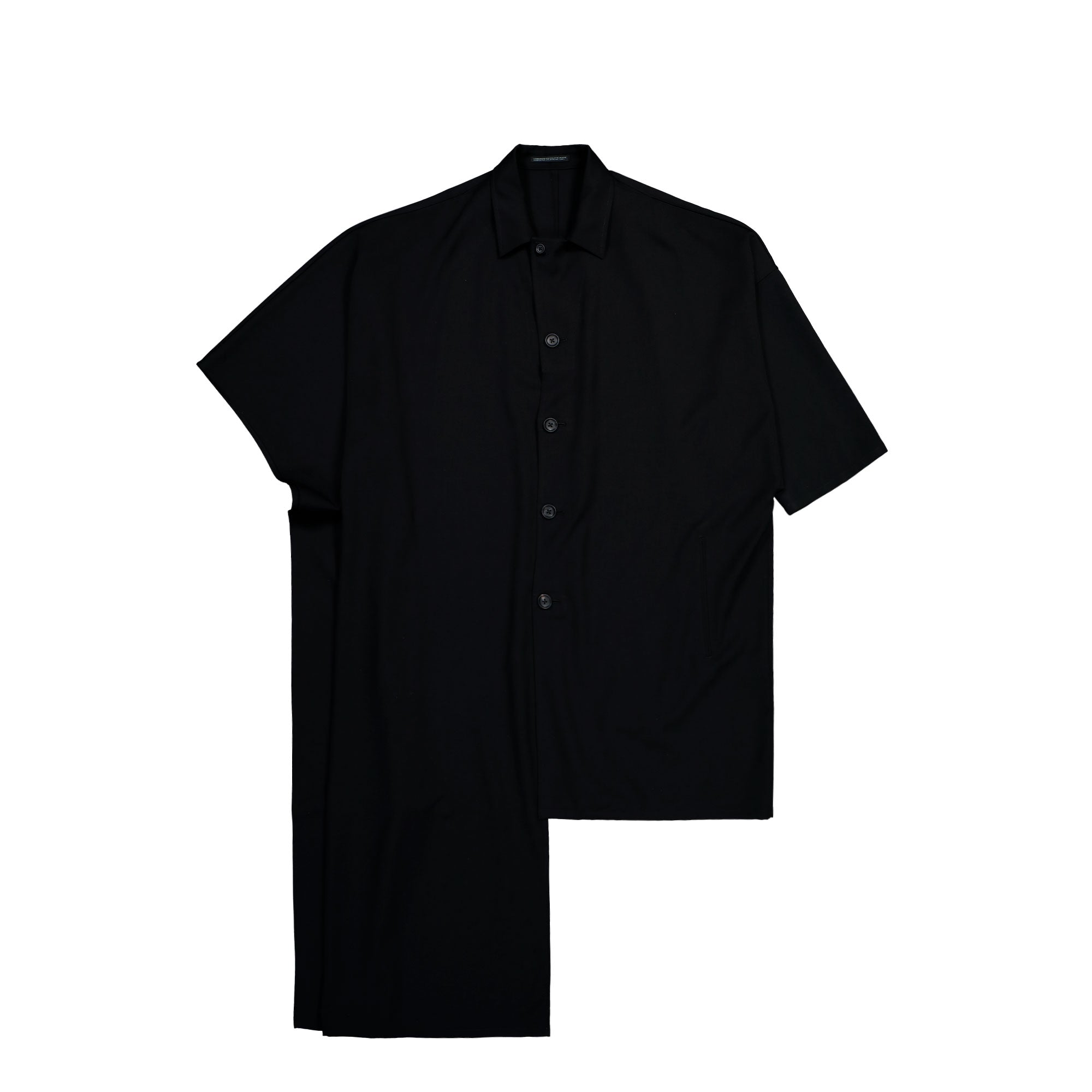 The Yohji Yamamoto Homme Gabardine Long Cape Jacket (HK-J55-100-2) in Black stands out as a distinctive designer piece defined by sculptural lines and avant-garde character. Crafted from dense, high-quality gabardine, the fabric features a fine, smooth texture and a fluid yet structured drape. The deep black appears rich and even, with a subtle matte surface that gently absorbs light and enhances the architectural silhouette. A defining element is the asymmetric, cape-inspired construction with an extended hem on one side, creating dynamic proportions and a unique shape. The concealed button placket with tonal buttons blends seamlessly into the minimalist aesthetic, while the classic collar provides a subtle contrast to the progressive cut. An integrated side pocket adds functional value to this designer jacket. Styled with slim trousers or wide silhouettes, this Yohji Yamamoto Homme piece represents modern, sophisticated menswear.
